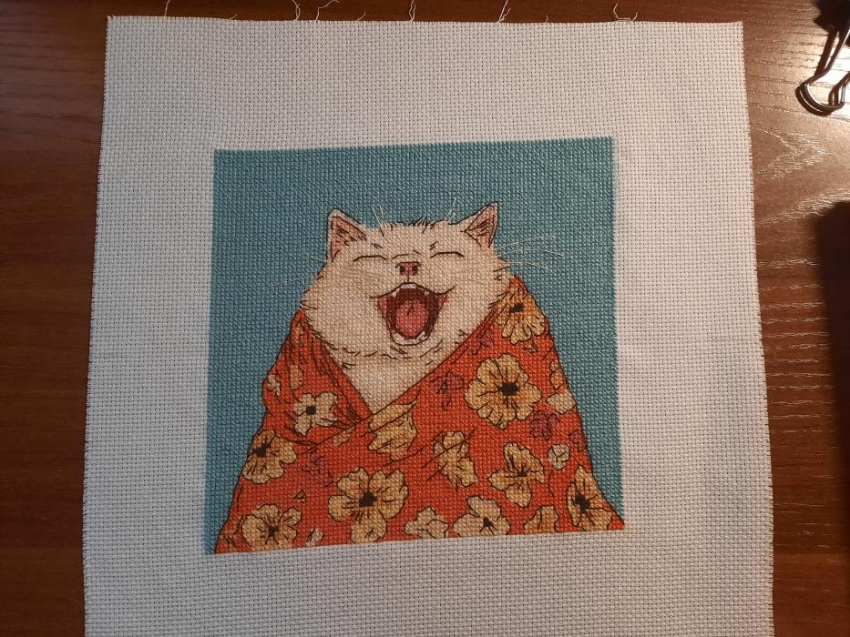 Всё бы хорошо, если б не попалась кривая канва, хотя, может, это я перетянула её пяльцами (но со мной такое впервые). По итогу из-за такого перекоса не получилось ровно вставить в рамку. Ниток хватило с лихвой, но 60см для зашивки таких больших площадей - мало, лучше б были по 90см (по крайней мере бирюзовые). Двусторонняя схема (для бэкстича и для зашивки крестом) - замечательно. Результат симпатичный, но сам процесс оказался уныленьким.